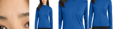 body: 6.49 oz./yd2 / 220 gsm, 100% polyester mélange jersey bonded with fleece; contrast: 6.49 oz./yd2 / 220 gsm, 100% polyester jersey bonded with fleece; Center front coil zipper with semi autolock slider ; Front and back princess seam for flattering feminine fit; Lower pockets with hidden snap closure; Tonal coverstitch details on armholes and shoulder seams;