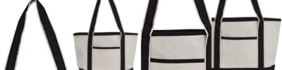 12 oz cotton canvas; Interior zippered pocket 5.5" W x 6.25" H; Exterior front pocket 7.5" W x 6" H; 31" handles with 12" drop; 18.5" x 12" x 5.5";
