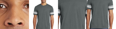 This tee has a retro, game-day inspired look. 4.5-ounce, 60/40 combed ring spun cotton/poly, 32 singles 1x1 rib knit neck Tear-away label Distressed printed stripes at sleeve Front and back yoke Shoulder to shoulder taping Please note: This product is transitioning from woven labels to tear-away labels. Your order may contain a combination of both labels.