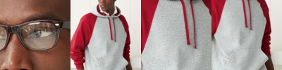 - Contrast color raglan sleeves, collar, "V", and waistband