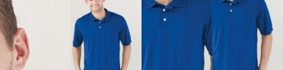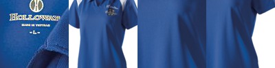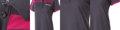4.8 ounce 50% polyester/50% cotton jersey knit * Contrast color collar and cuffs * Set-in sleeves