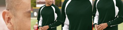 - Contrast color side gussets and sleeve stripes